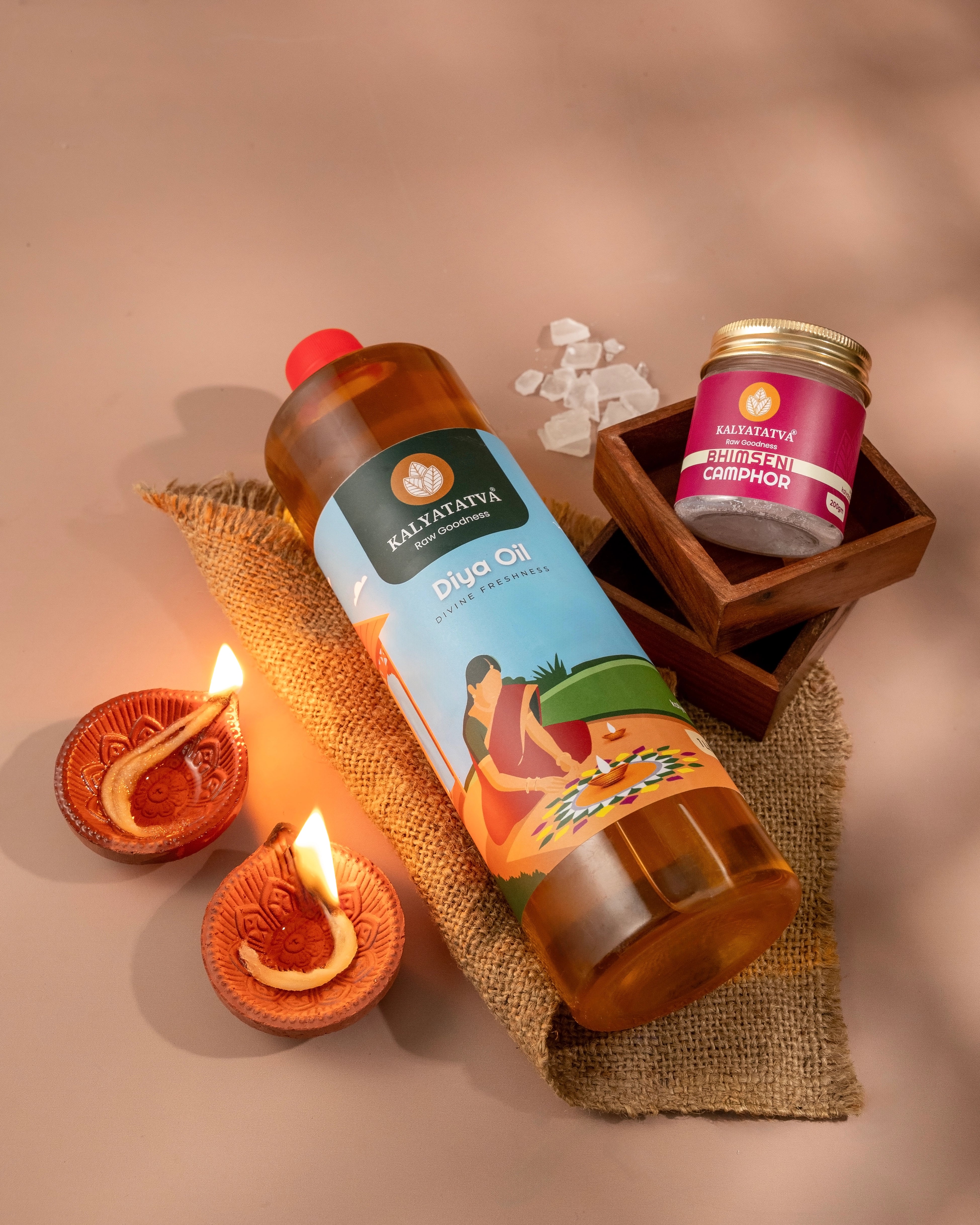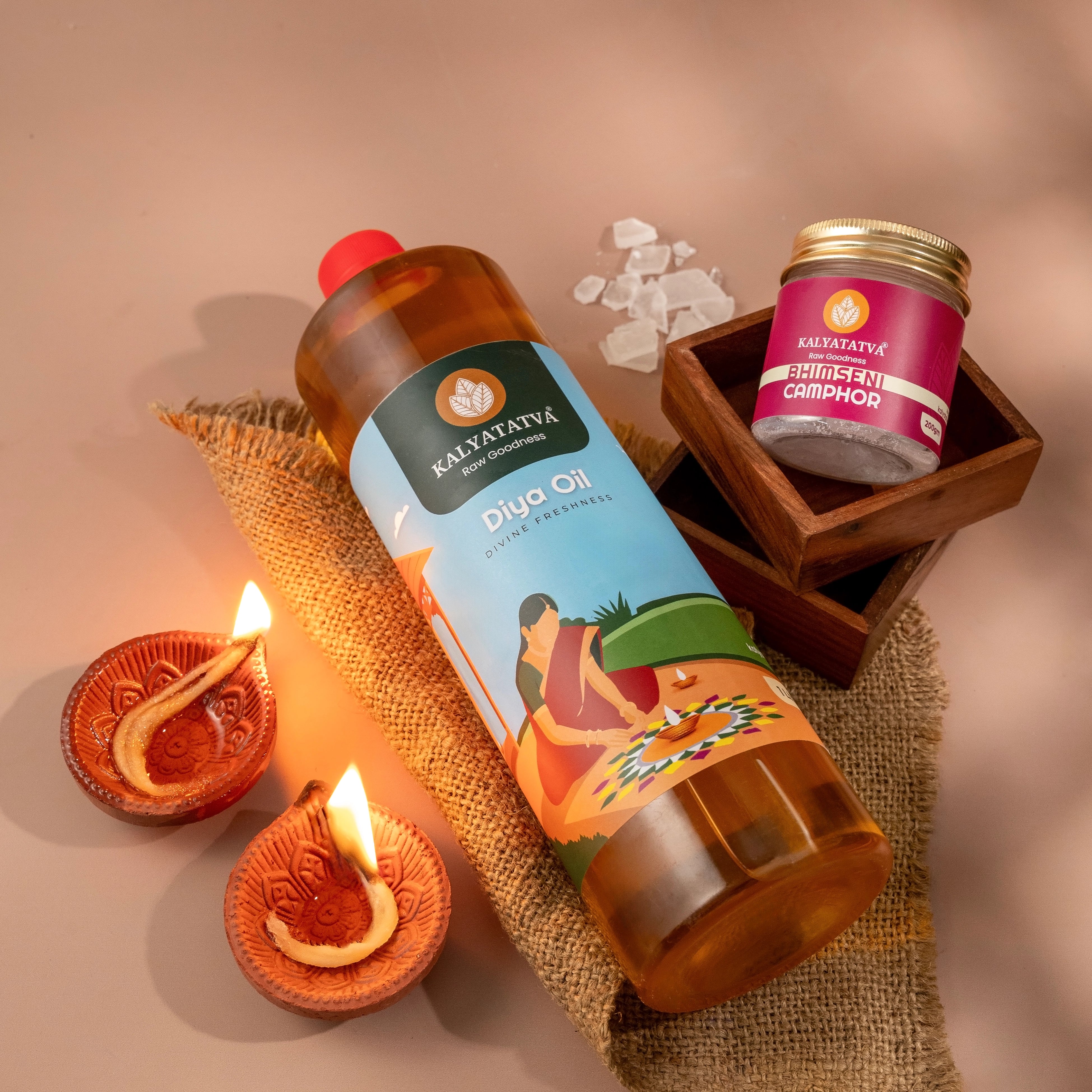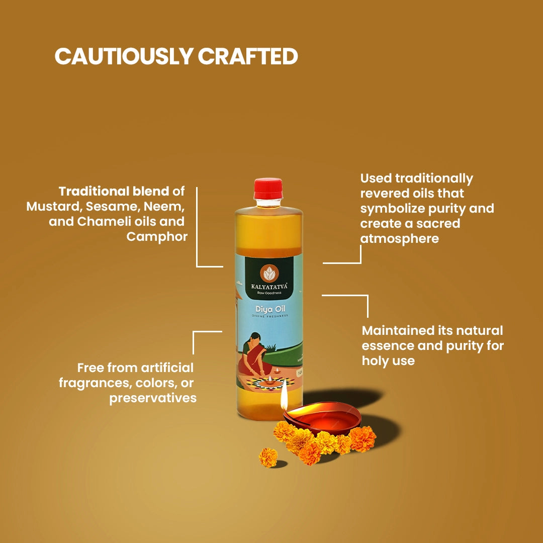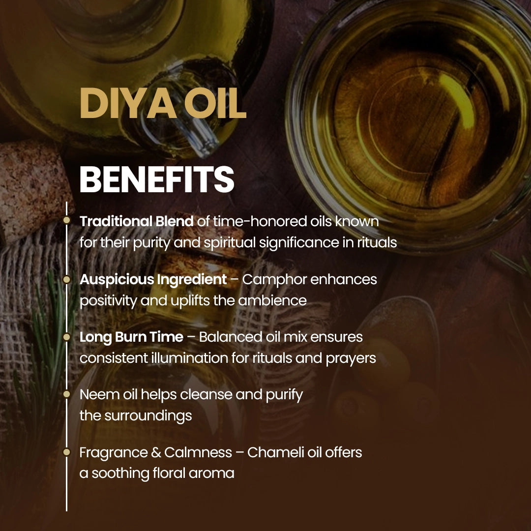 Our diya oil is 100% natural, chemical-free, and prepared using traditional methods for a clean, bright, and long-lasting flame.
