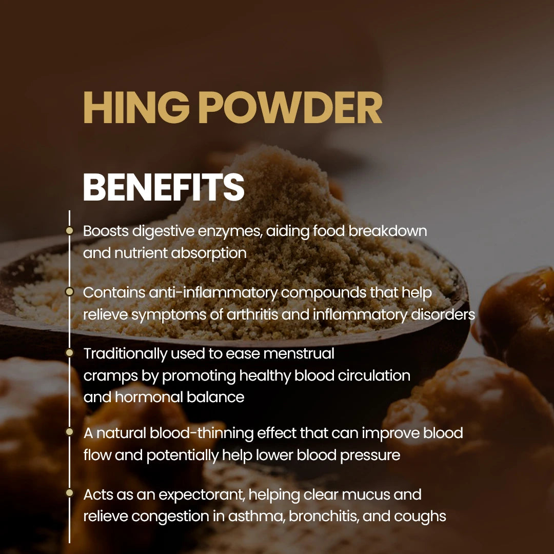 Hing is known to aid digestion, reduce bloating, support respiratory health, and boost immunity.